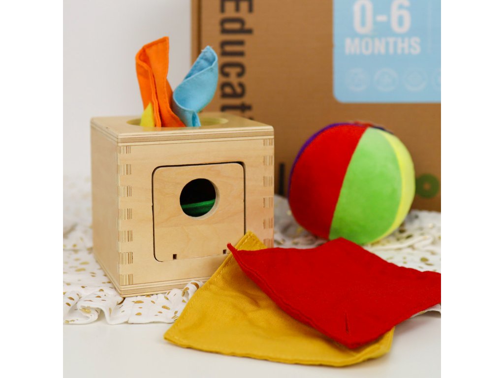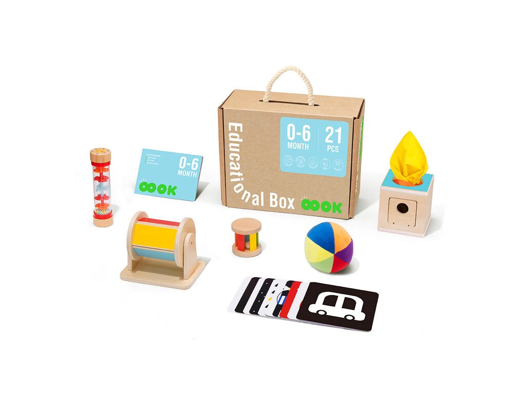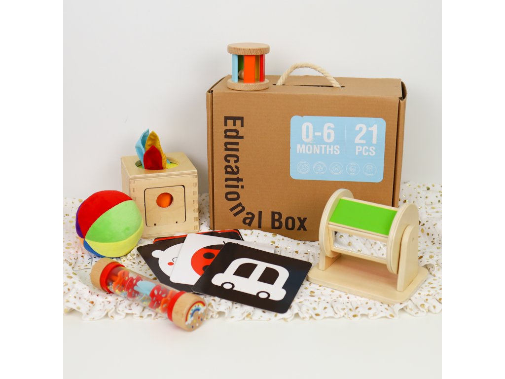 0–6 mesiacov Edukačný box Baby 6 ks 6 senzorických hračiek pre bábätká v jednom balení Edukačný box Baby od Tooky Toy je určený pre bábätká od narodenia až približne do 6 mesiacov. Obsahuje 6 montessori senzorických a didaktických hračiek, ktoré podporujú zdravý psychomotorický rozvoj vášho bábätka a podnecujú jeho zmysly: zrak, hmat aj sluch. Nechýba ani podrobná príručka pre rodičov, vďaka ktorej budete vedieť, kedy akú hračku bábätku predstaviť a ako sa s ňou hrať.Box obsahuje:10 obojstranných kontrastných kartičiek,plyšovú loptičku s rolničkou,presýpaciu dažďovú palicu,drevenů hrkálku,otočný chrastiaci bubon,box na vyťahovanie farebných vreckoviek,návod na použitie v angličtine.Bezpečné vzdelávacie hračky pre najmenších Vďaka Edukačnému boxu nebudete kupovať zbytočne veľa nevhodných či plastových hračiek. Hračky Tooky Toy sú vyrábané s ohľadom na životné prostredie z dreva z udržateľného lesníctva. Farby sú netoxické a úplne bezpečné. Až dieťatko vyrastie, postúpi k ďalšiemu Edukačnému boxu 7–12 mesiacov a tento môžete nechať pre mladších súrodencov alebo venovať niekomu inému. Edukačný box Tooky Toy je vhodný ako darček na baby shower alebo pri príležitosti narodenia bábätka.Dodatočné parametre