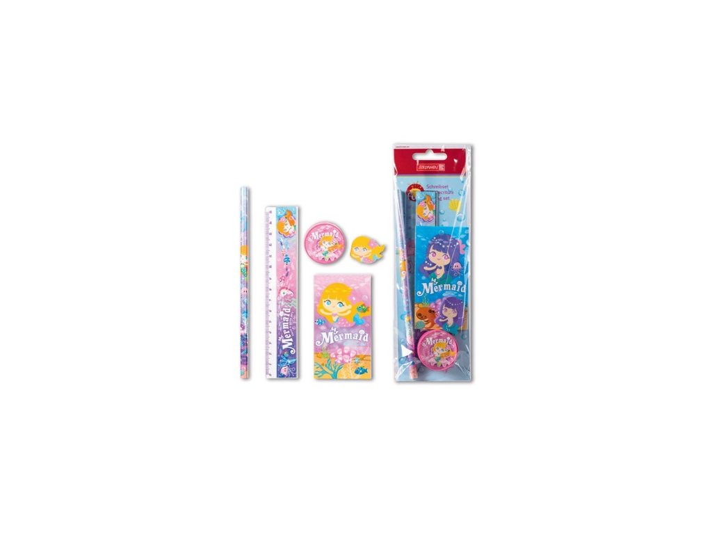 Štartovací písací set Brunnen s motívom morských panien obsahuje písací blok, ceruzku, 15 cm pravítko, gumu a strúhadlo.