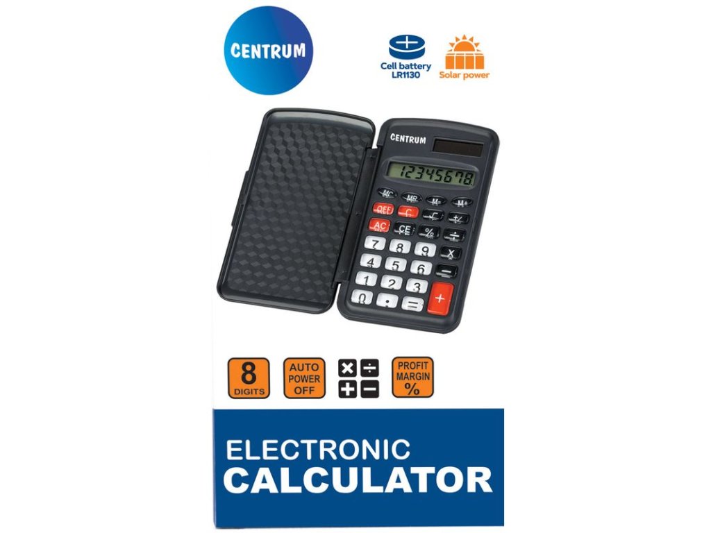 Vrecková kalkulačka s tvrdým plastovým puzdrom a 8 miestnym displejom. Výpočet percent a odmocniny. Duálne napájanie - solárne/ batériové (1 x LR1130), rozmery 96 x 63 x 12 mm.