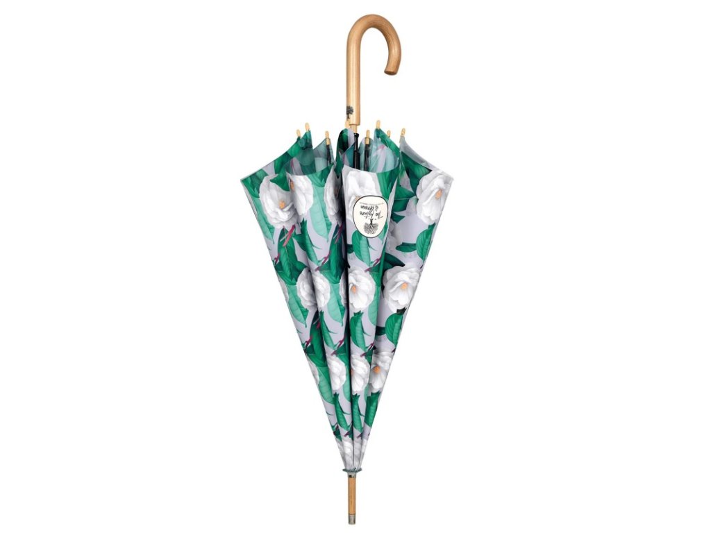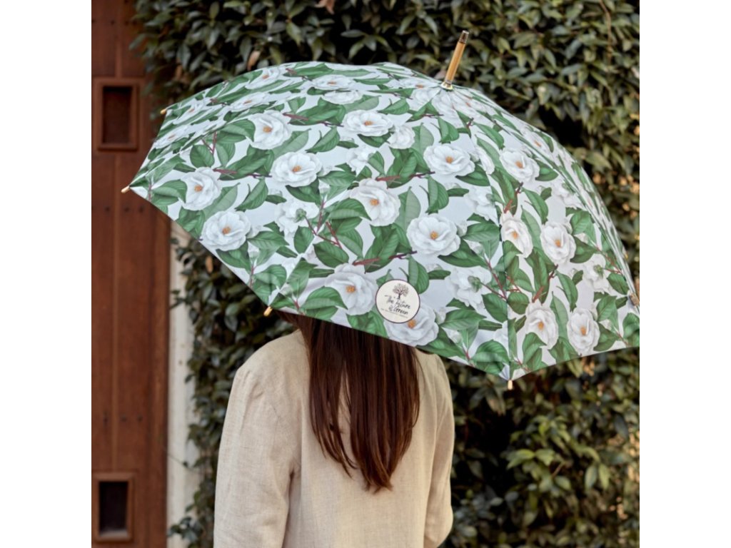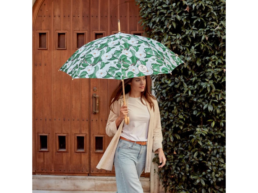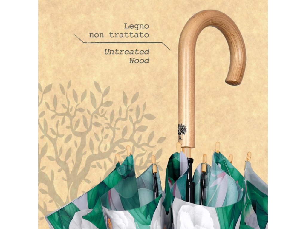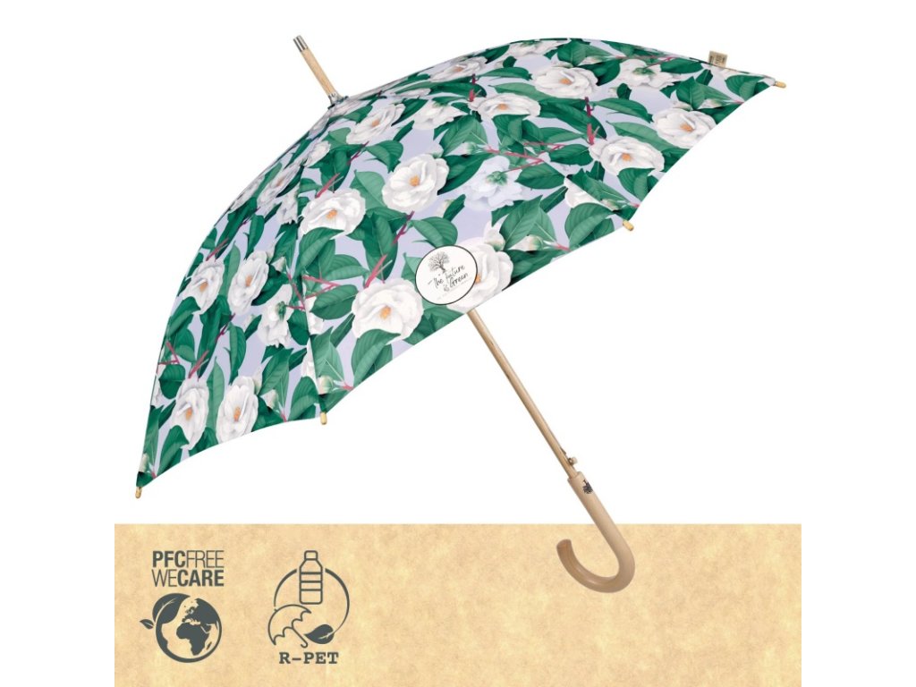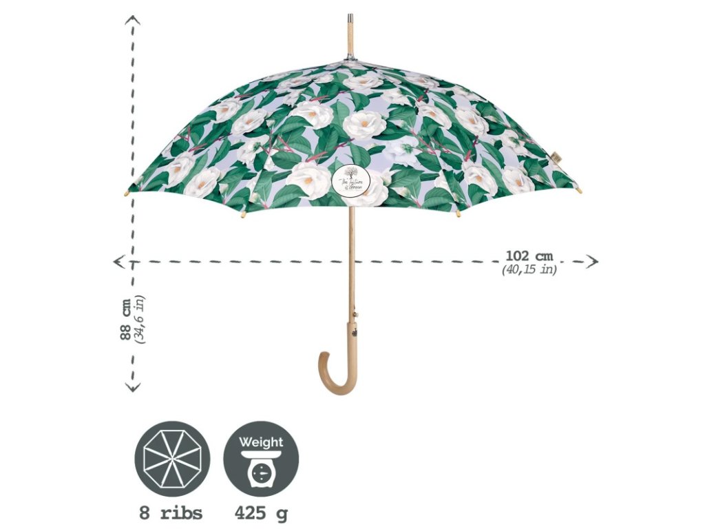 Ergonomická rukoväť a zatváracie tlačidlo sú vyrobené z biologicky odbúrateľného dreva, čo ešte viac podčiarkuje ekologický charakter tohto dáždnika. Vďaka tomu sa Green Camelie stáva nielen funkčným doplnkom, ale aj štýlovým vyjadrením vášho postoja k udržateľnosti.