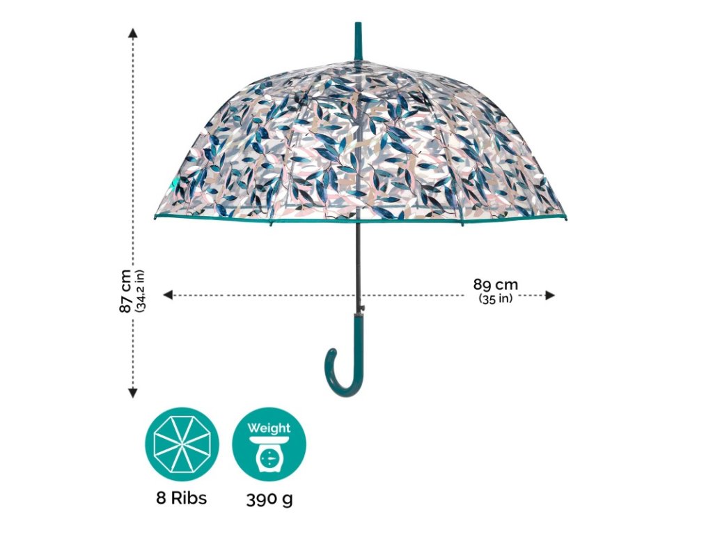Dáždnik má kupolovitý tvar pre lepšiu ochranu pred dažďom a široký priemer 89 cm. Vyrobený je z POE plastu – priehľadného a netoxického materiálu, ktorý je šetrný k životnému prostrediu aj pokožke. Konštrukcia z kvalitného fiberglassu je ľahká a zároveň pevná, takže si poradí aj s vetrom.