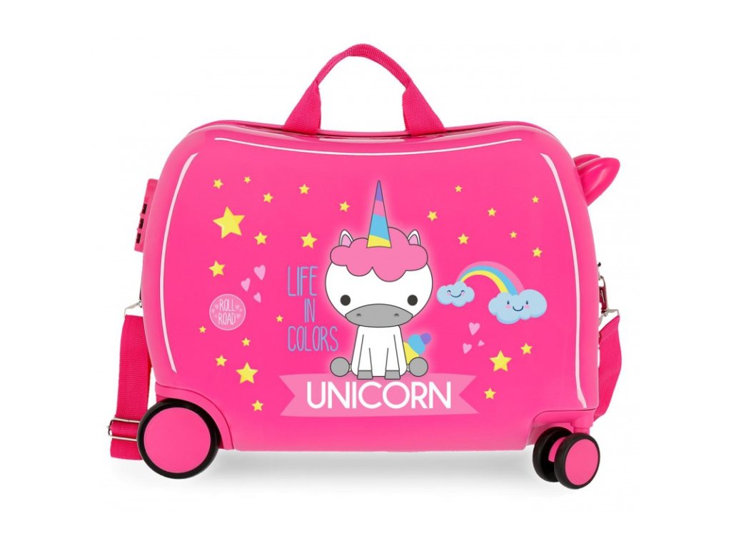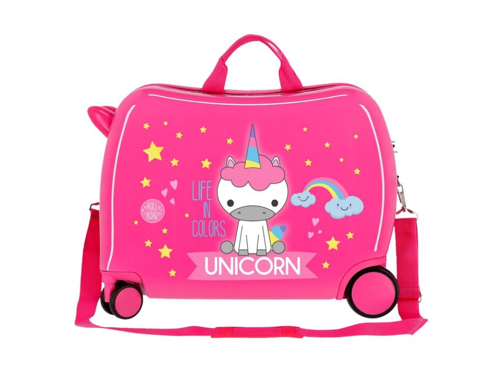 Detský cestovný kufor na kolieskach / odrážadlo LITTLE ME UNICORN s nádherným dizajnom jednorožca je skvelým spoločníkom na cesty pre malých cestovateľov. Tento pevný kufor z odolného ABS plastu je vybavený štyrmi kolieskami, z ktorých predné dve sú otočné o 360° pre ľahkú manipuláciu. Kufor sa môže používať aj ako odrážadlo, čo poskytuje deťom ďalšiu zábavu počas cestovania. Integrovaný číselný zámok a odnímateľný popruh na rameno zaručujú bezpečnosť a pohodlné nosenie. S vnútorným objemom 34L a rozmermi 50 x 20 x 38 cm je ideálny aj ako palubná batožina.