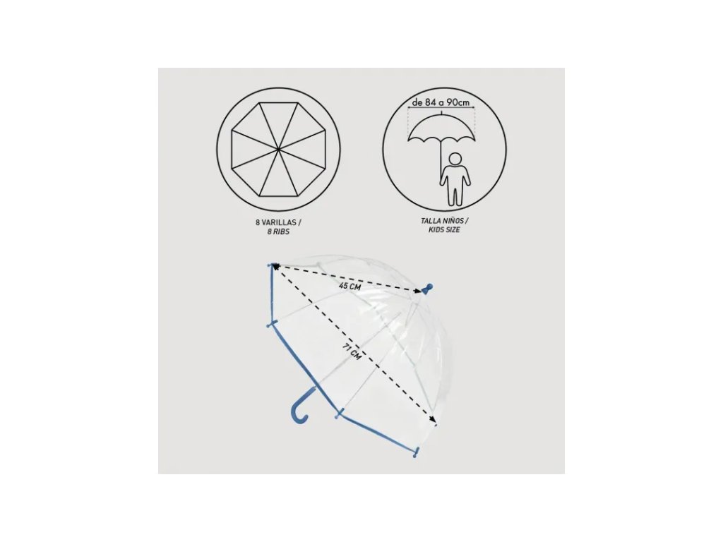 • priemer vystretého dáždnika je 71cm• 100% PVC, kvalitná pevná a odolná konštrukcia, plastová rúčka
