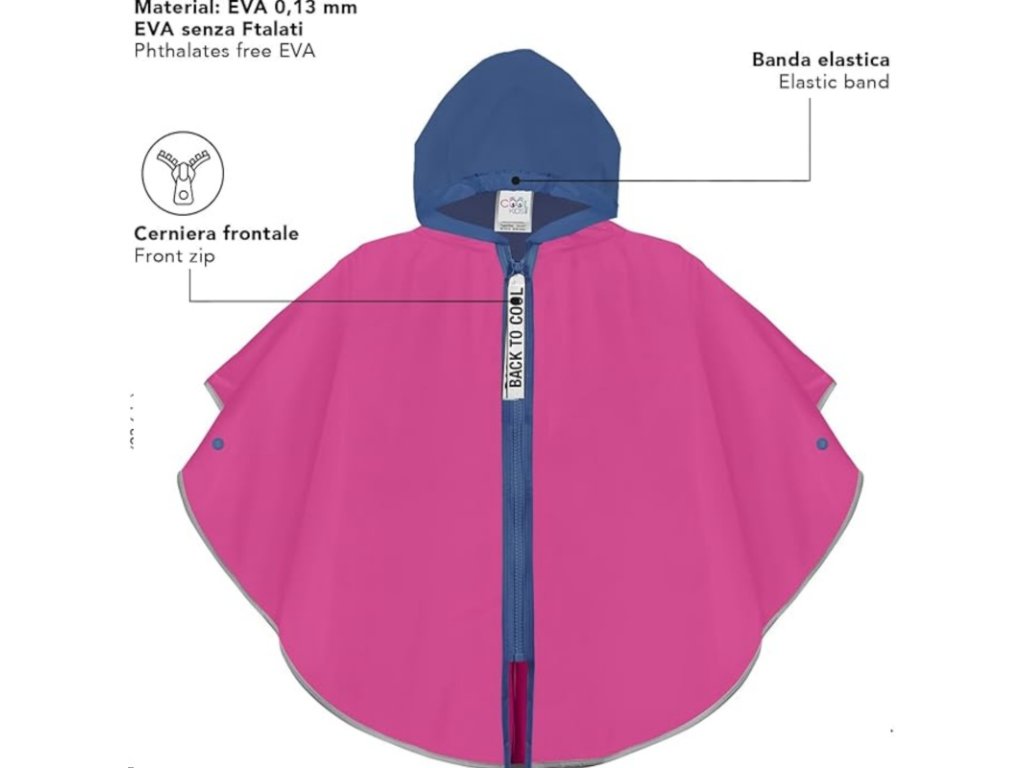 Pončo je vyrobené z kvalitného a ľahkého EVA materiálu, ktorý je odolný voči vode, vetru aj blatu. Praktický strih zabezpečí, že v daždi prekryje aj školskú tašku či batoh. Kapucňa s elastickým lemom ochráni hlavičku pred dažďom a zips v prednej časti umožní jednoduché obliekanie.