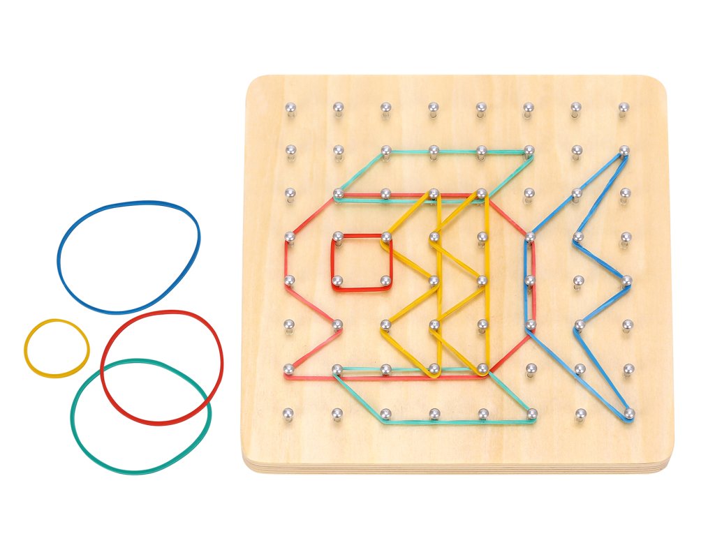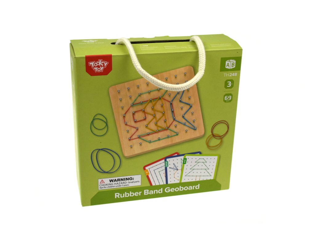 Geoboard Vytvor si obrázok z gumičiek! Vďaka tejto kreatívnej hračke od Tooky Toy si deti môžu pomocou geoboardu a gumičiek vytvoriť obrázok podľa seba aj podľa predlôh. Geoboard sa bežne využíva v matematike pre lepšie pochopenie rovinnej geometrie. Tento geoboard má v sebe 64 malých skrutiek. Balenie obsahuje geoboard, 48 farebných gumičiek a 20 obojstranných predlohových kariet – dohromady teda 40 predlôh rozdelených do troch úrovní obtiažnosti. S tými ťažšími sa zabavia aj dospelí.Deti si rozvíjajú matematické schopnosti. Učia sa základné geometrické tvary, ako je možné ich spájať a vytvárať z nich obrázky. Pri hre musí tiež trochu počítať. Zlepšujú si pozorovacie schopnosti a jemnú motoriku. Hračka je vhodná pre deti od 3 rokov.Dodatočné parametre