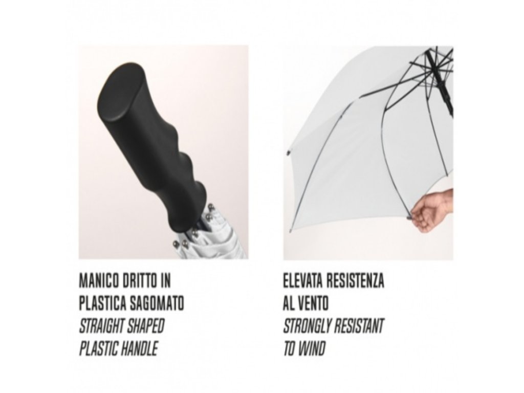 Dáždnik je vybavený manuálnym otváraním a robustnou konštrukciou zo sklolaminátu, ktorá výborne odoláva nárazom vetra. Rovná plastová rúčka sa pohodlne drží v ruke a zabezpečuje pevný úchop. Polyesterová tkanina poskytuje spoľahlivú ochranu a zároveň rýchlo schne.