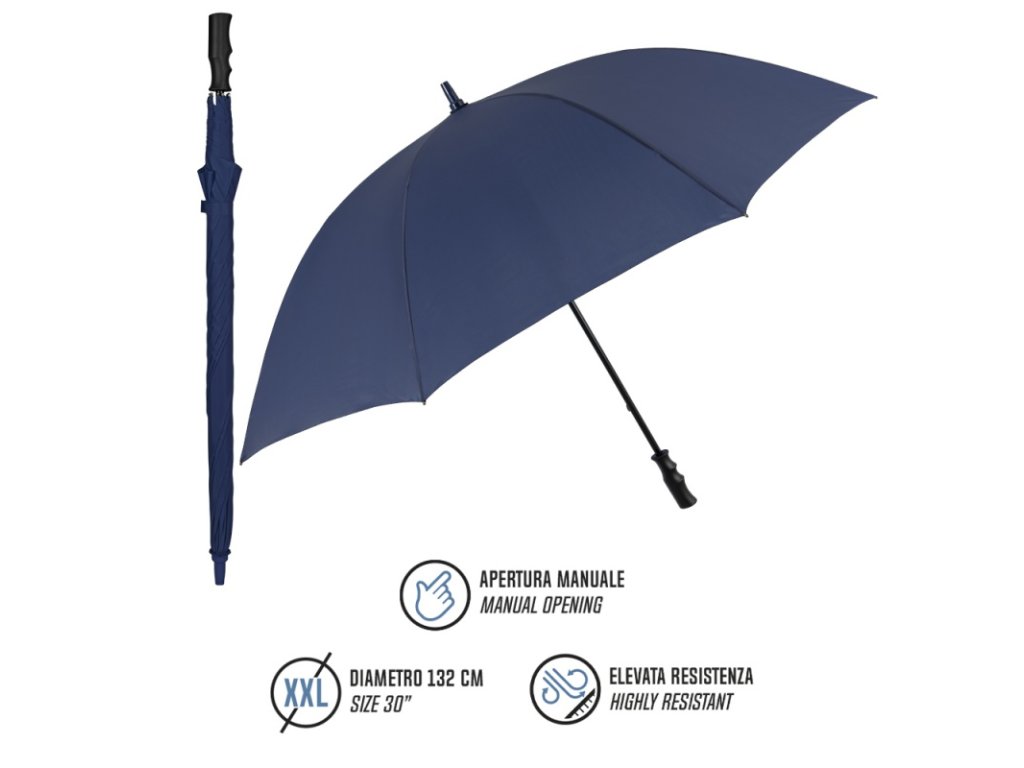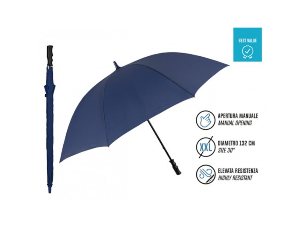 Perletti Promotional Navy je spoľahlivý golfový dáždnik pre tých, ktorí hľadajú veľký a odolný dáždnik do každého počasia. Vďaka manuálnemu otváraniu je ovládanie jednoduché a bezpečné. Široký priemer 132 cm poskytne spoľahlivú ochranu pred dažďom aj vetrom – ideálny na ihrisko, prechádzku či do mesta.