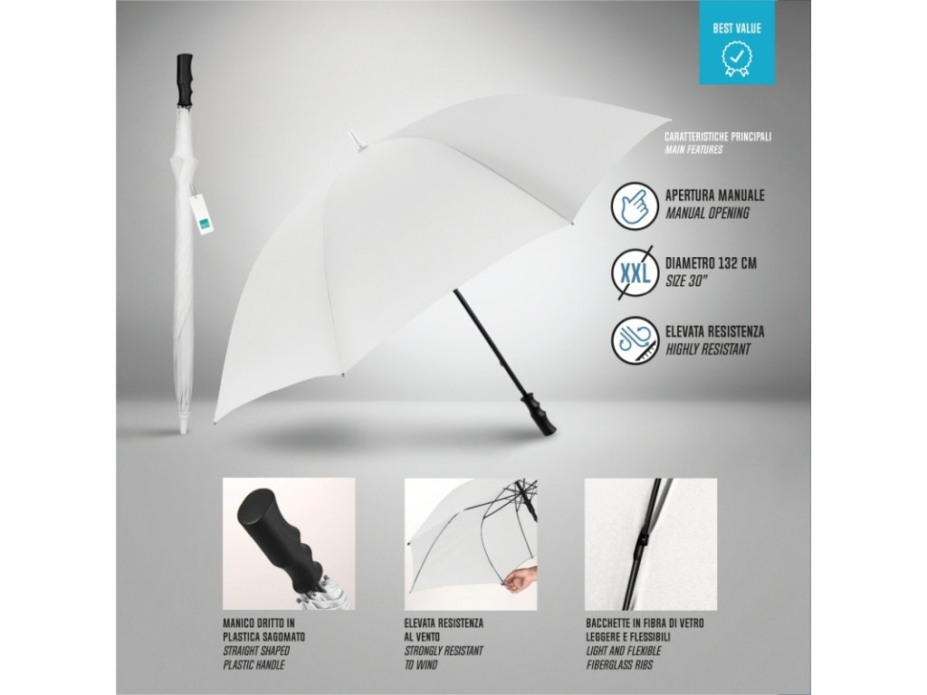 Perletti Promotional White vyniká čistým dizajnom a profesionálnym vzhľadom. Je ideálny pre spoločenské udalosti, golf, svadby alebo aj ako praktický doplnok pre firemné akcie. Manuálne otváranie umožňuje jednoduché a spoľahlivé rozloženie dáždnika, zatiaľ čo široký priemer 132 cm zaisťuje výborné krytie.