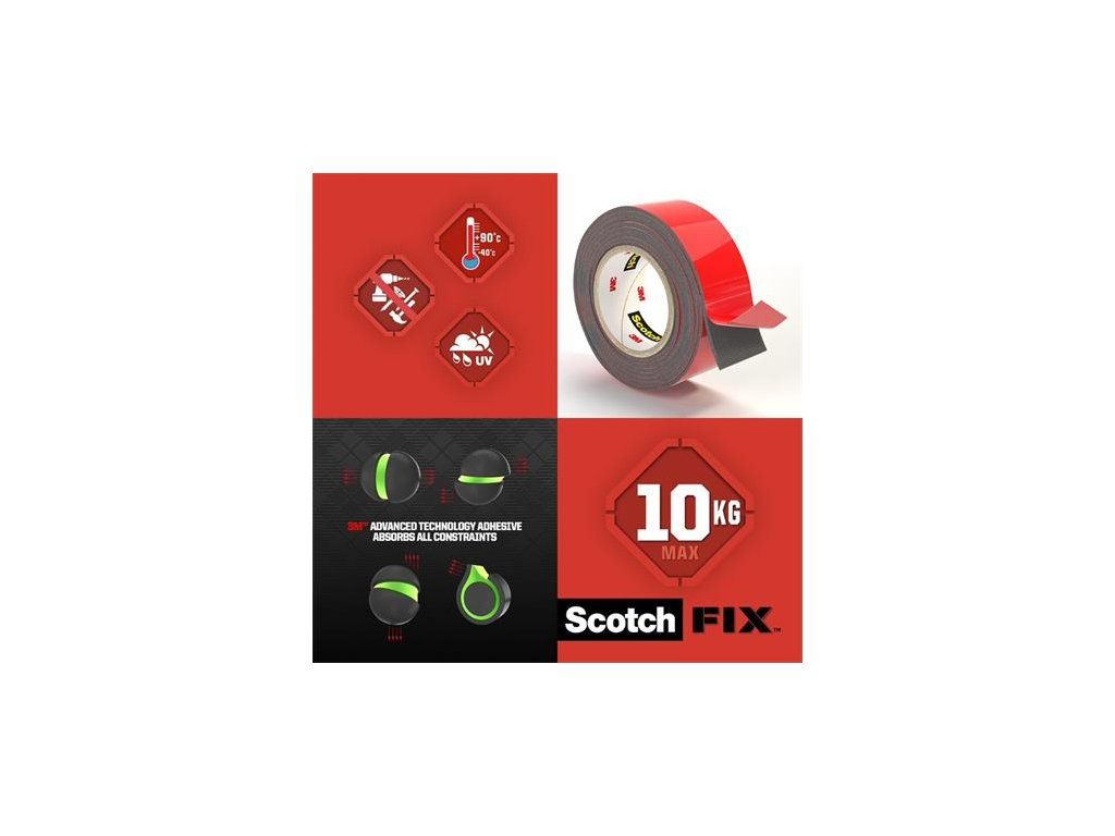Či už pripevňujete novú poštovú schránku k plotu alebo plánujete nový prvok steny pre vašu záhradu, obojstranná páska Scotch-Fix™ Extreme Outdoor zvládne prácu rýchlo a jednoducho bez akéhokoľvek náradia. - má silnú lepiacu vrstvu - nosnosť 13 kg -má funkciu odolnú voči poveternostným vplyvom poskytujú trvanlivé spojenie -balenie bez plastov pre trvalú udržateľnosť - obalový materiál je vyrobený z 90% recyklovaného materiálu - vnútro roliek je zo 100% recyklovaného materiáluDodatočné parametre