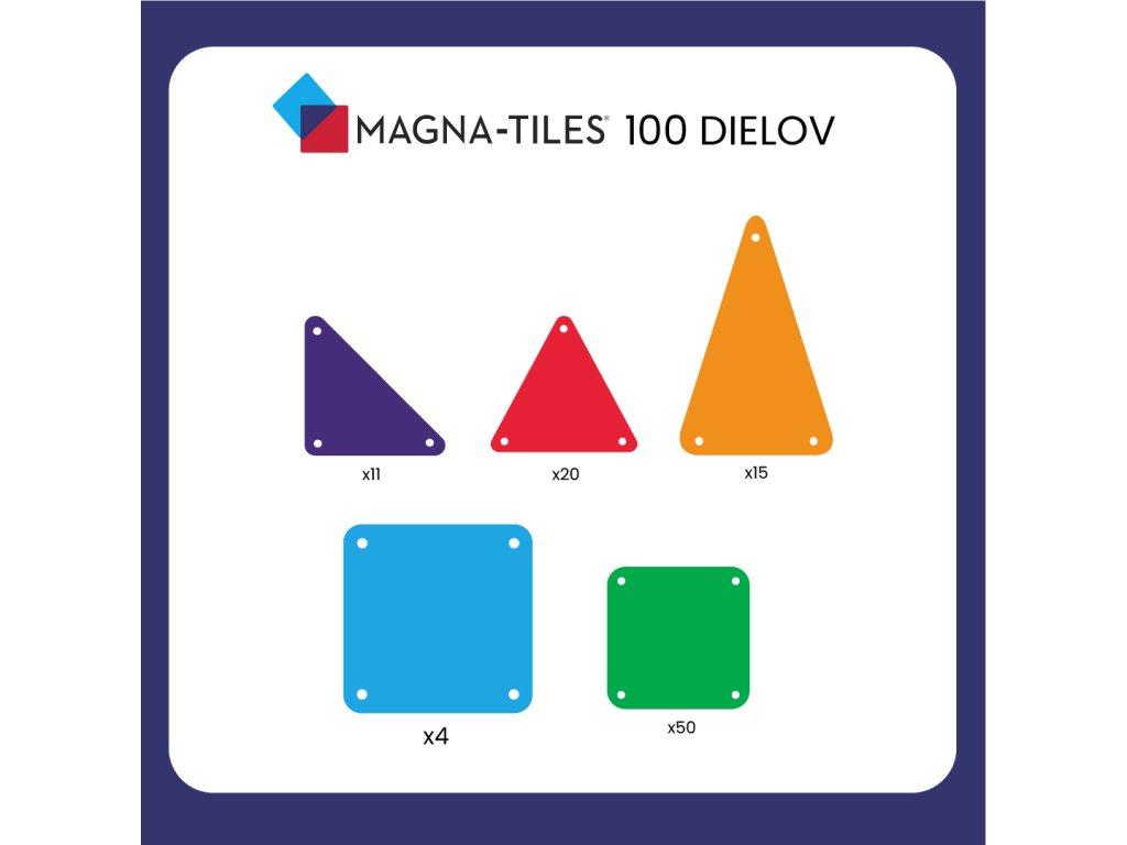 Magnetická stavebnica 100 dielov Nekonečná zábava s magnetickou stavebnicou Originálna magnetická stavebnica Magna-Tiles® Clear Colours prináša deťom hodiny nápaditej a sústredenej zábavy. Sada obsahuje 100 farebných štvorcov a trojuholníkov rôznych veľkostí, aby si deti mohli vytvoriť všetko, o čom snívajú. Stavebnica je kompatibilná so všetkými súpravami Magna-Tile®, čo umožňuje nekonečné možnosti kombinácií. Zmysluplná stavebnica pre malých staviteľov Magna-Tiles je zástancom zmysluplnej hry, to znamená zábavnej a pútavej, no zároveň založenej na rozvíjaní detských zručností. Táto stavebnica podporuje rozvoj koordinácie ruka-oko, jemnej motoriky a logického myslenia prostredníctvom skúmania príčiny a následku. Bezpečnosť a špičková kvalita sú zaistené použitím potravinárskeho, netoxického plastu MABS bez BPA, ftalátov a latexu. Pevná konštrukcia dielikov zabraňuje praskaniu a udržiava magnety bezpečne na svojom mieste.Sada obsahuje 100 magnetických dielikov:50x štvorec,4x veľký štvorec,20x rovnostranný trojuholník,11x pravý trojuholník,15x rovnoramenný trojuholník.
