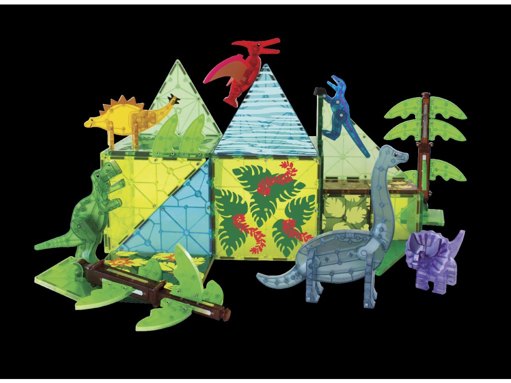 Magnetická stavebnica Dino Svet XL 50 dielov Poskladajte si úžasný dinosaurí svet Magnetická sada XL Dino World v sebe ukrýva najväčšiu stavebnicu všetkých čias. Obsahuje šesť magnetických figúrok dinosaurov, ktoré sa líšia veľkosťou a všetky majú pohyblivé časti pre ešte zábavnejšiu imaginárnu hru. V spojení s magnetickými stromami a listami si vybudujete dokonalý tropický raj. Deti okrem jemnej motoriky a logiky zároveň rozvýjajú záujem o paleonotológiu. Stavebnica je kompatibilná so všetkými súpravami Magna-Tiles®.Zmysluplná stavebnica pre malých staviteľov Magna-Tiles je zástancom zmysluplnej hry, to znamená zábavnej a pútavej, no zároveň založenej na rozvíjaní detských zručností. Táto stavebnica podporuje rozvoj koordinácie ruka-oko, jemnej motoriky a logického myslenia prostredníctvom skúmania príčiny a následku. Bezpečnosť a špičková kvalita sú zaistené použitím potravinárskeho, netoxického plastu MABS bez BPA, ftalátov a latexu. Pevná konštrukcia dielikov zabraňuje praskaniu a udržiava magnety bezpečne na svojom mieste.Sada obsahuje 50 magnetických dielikov:6x figúrka dinosaurov - Pteranodon (červený), T-Rex (zelený), Stegosaurus (žltý) a Velociraptor (modrý), Triceratops (fialový) a Brachiosaurus (bridlicovo modrý),6x veľký štvorec,6x veľký pravý trojuholník,4x, veľký rovnostranný trojuholník,8x štvorec,2x pravý trojuholník,16x list stromov,2x stromová základňa.Dodatočné parametre
