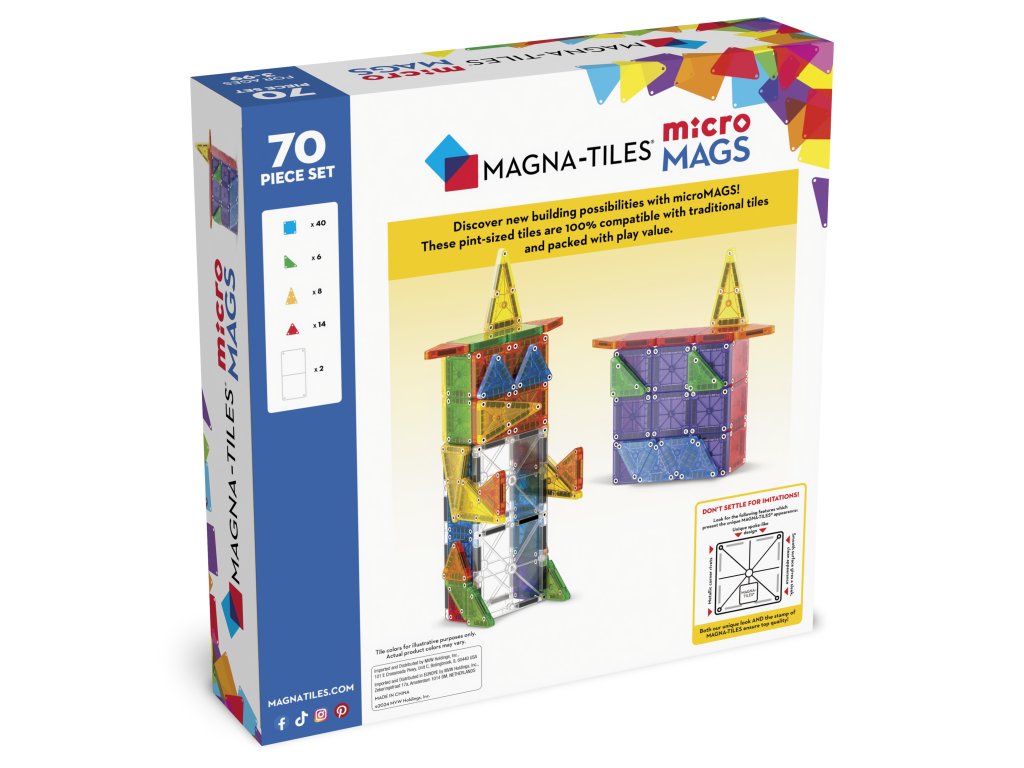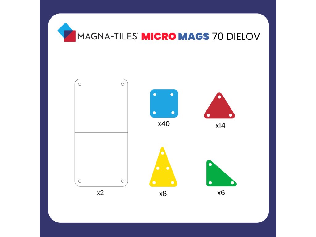 Magnetická stavebnica microMAGS Deluxe Set 70 dielov Cestovná sada stavebnice Magna-Tiles vhodná na cestovanie Magnetická stavebnica microMAGS Deluxe Set ponúka jedinečný zážitok z hrania.Prináša dokonalé spojenie medzi microMAGS a klasickými dlaždicami MAGNA-TILES.MicroMAGS sú o 75 % menšie ako tradičné diely, čo umožňuje ešte detailnejšie stavby a podporuje rozvoj jemných motorických zručností.Stavebnica je plne kompatibilná so všetkými ostatnými stavebnicami MAGNA-TILES.Zmysluplná stavebnica pre malých staviteľov Stavebnica je nielen praktická, ale aj vysoko kvalitná a bezpečná. Dieliky sú vyrobené z potravinárskeho, netoxického plastu, ktorý neobsahuje BPA, ftaláty ani latex. Silné magnety a pevná konštrukcia zabezpečujú dlhú životnosť a nekonečné hodiny tvorivej zábavy. Táto stavebnica podporuje rozvoj jemných motorických zručností, koordinácie ruka-oko a kreativity, čo z nej robí ideálny darček pre deti vo veku už od 3 rokov.Sada obsahuje 70 magnetických dielikov: 2x veľký obdĺžnik,6x pravé trojuholníky microMAGS,8x rovnoramenný trojuholník microMAGS,14x rovnostranný trojuholník microMAGS,40x štvorec microMAGS.Dodatočné parametre