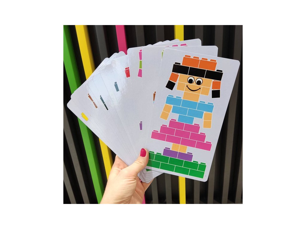 12 farebných inšpiračných kariet – učenie sa stavať postavičky, zvieratká a vozidlá krok za krokom.
