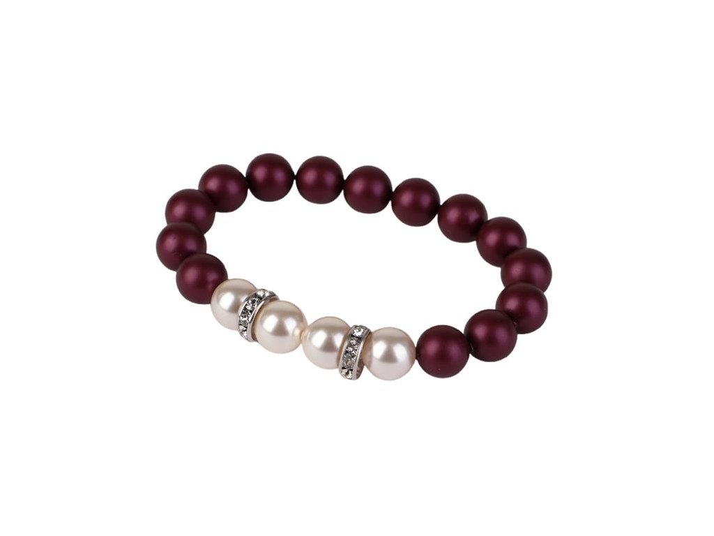 Originálny náramok vyrobený zo Swarovski® perál, zdobený bielymi Swarovski® rondellovými krištálmi. Perly majú bordovo fialový a biely odtieň. Ide o elegantnú farbu, vhodnú aj k slávnostnému oblečeniu. Náramok sa ľahko nasadzuje aj skladá, keďže je navlečený na elastickej šnúrke. Veľkosť M, približne 18,5 cm, čo je štandardná dámska veľkosť. Balenie obsahuje navliekaciu šnúrku a jednu náhradnú perlu. Balené v darčekovej krabičke.Dodatočné parametre