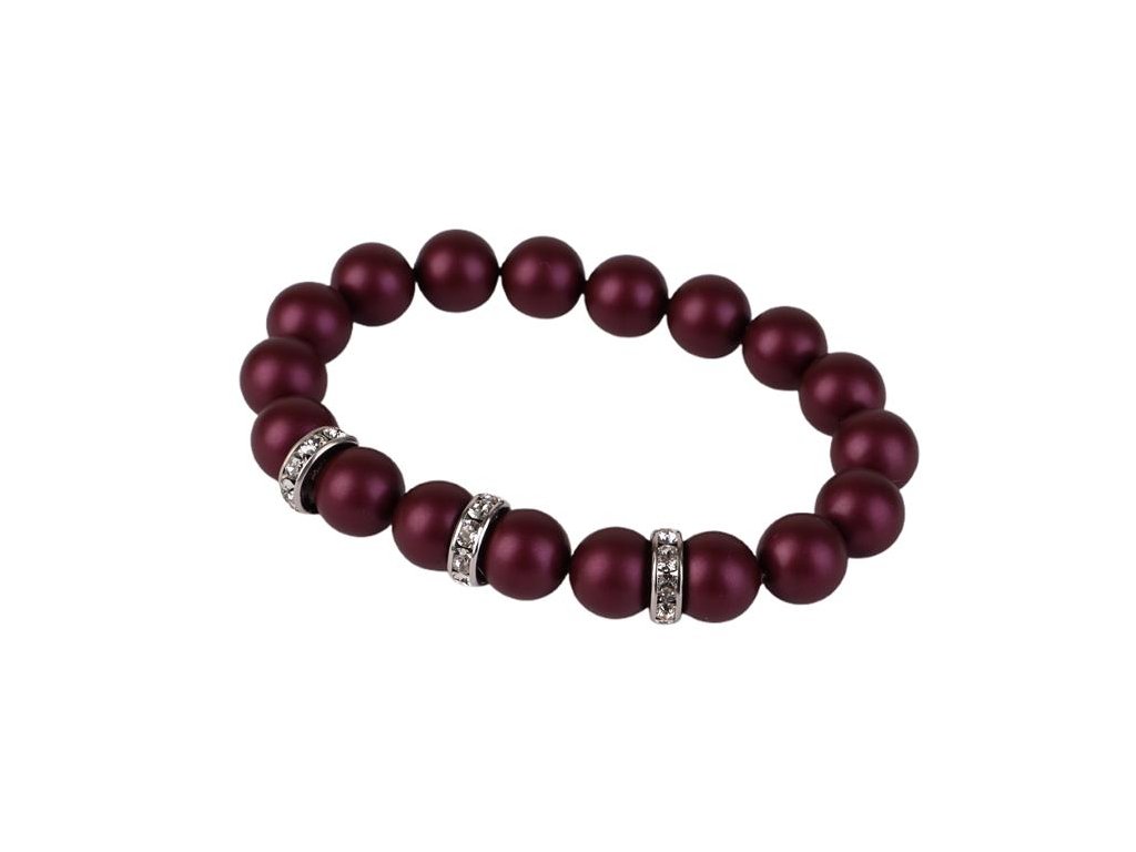 Originálny náramok vyrobený zo Swarovski® perál, zdobený bielymi Swarovski® rondellovými krištálmi. Perly majú bordovo fialový odtieň. Ide o elegantnú farbu, vhodnú aj k slávnostnému oblečeniu. Náramok sa ľahko nasadzuje aj skladá, keďže je navlečený na elastickej šnúrke. Veľkosť M, približne 18,5 cm, čo je štandardná dámska veľkosť. Balenie obsahuje navliekaciu šnúrku a jednu náhradnú perlu. Balené v darčekovej krabičke.Dodatočné parametre