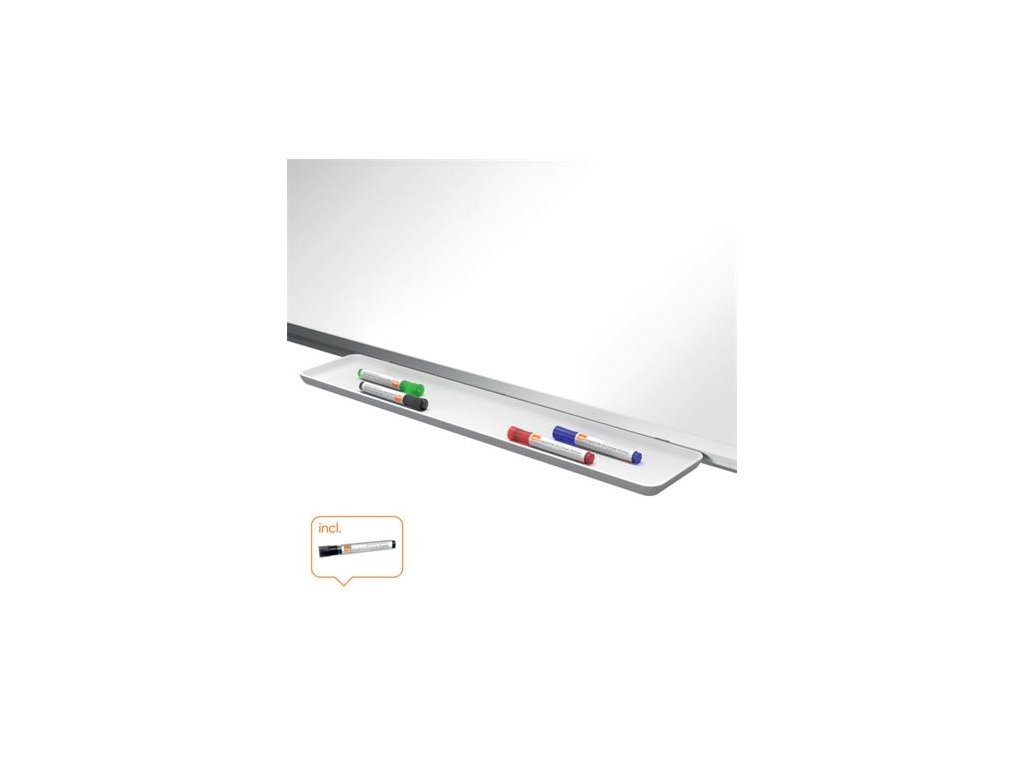 Širokouhlá, smaltovaná magnetická tabuľa s moderným vzhľadom a úzkym rámom a väčšou plochou na písanie. Systém InvisaMount uľahčuje montáž a skryje upevňovacie časti za tabuľu. K tabuli je štýlový držiak na pero s podnosom na uloženie popisovačov a utierok vysoko zmazateľný smaltovaný povrch na časté použitie, záruka na povrch 25 rokov a darček NOBO popisovač. Rozmery tabule sú 150x100 cm