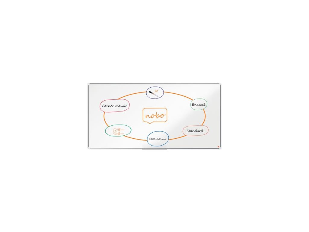 Širokouhlá, smaltovaná magnetická tabuľa s moderným vzhľadom a úzkym rámom a väčšou plochou na písanie. Systém InvisaMount uľahčuje montáž a skryje upevňovacie časti za tabuľu. K tabuli je štýlový držiak na pero s podnosom na uloženie popisovačov a utierok vysoko zmazateľný smaltovaný povrch na časté použitie, záruka na povrch 25 rokov a darček NOBO popisovač. Rozmery tabule sú 180x90 cm
