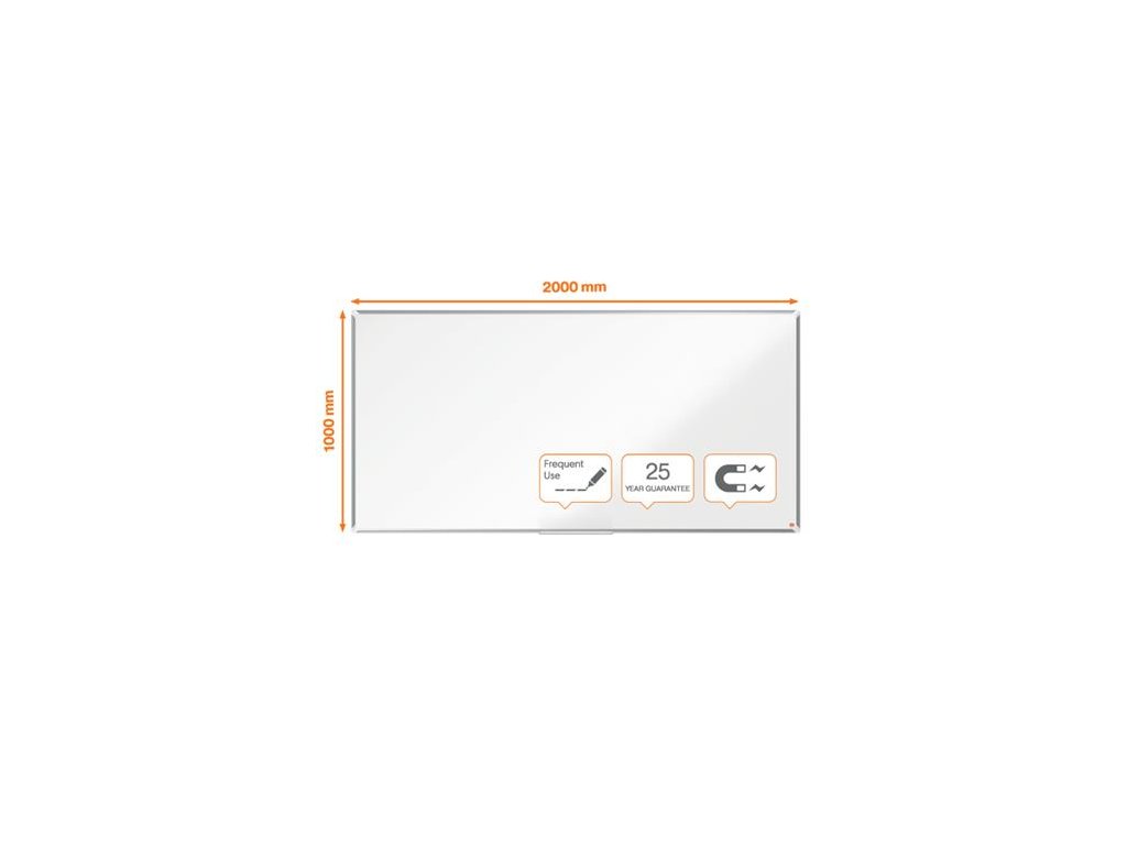 Širokouhlá, smaltovaná magnetická tabuľa s moderným vzhľadom a úzkym rámom a väčšou plochou na písanie. Systém InvisaMount uľahčuje montáž a skryje upevňovacie časti za tabuľu. K tabuli je štýlový držiak na pero s podnosom na uloženie popisovačov a utierok vysoko zmazateľný smaltovaný povrch na časté použitie, záruka na povrch 25 rokov a darček NOBO popisovač. Rozmery tabule sú 200x100 cm
