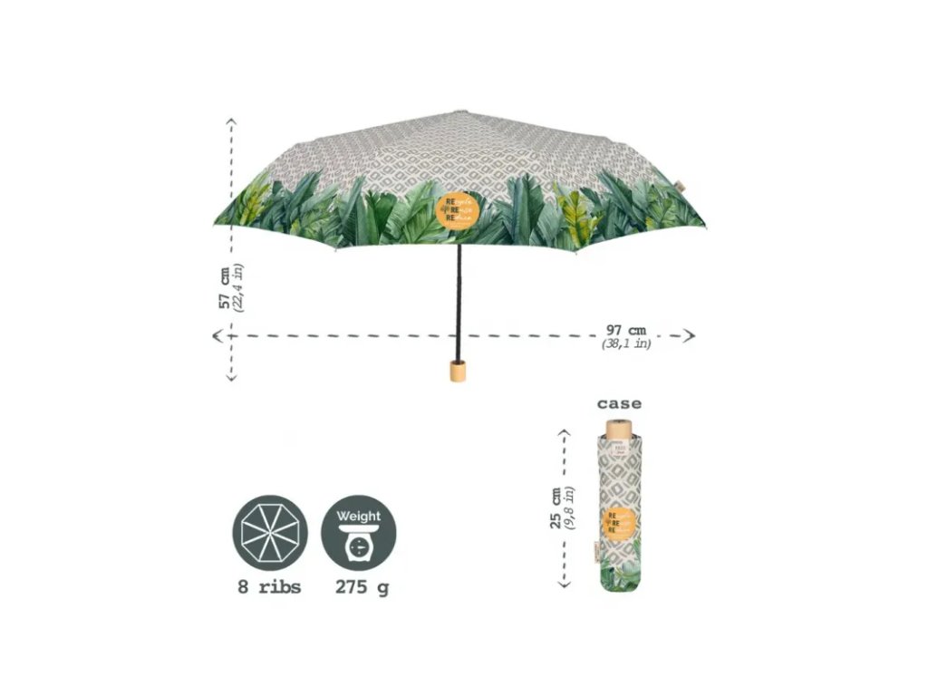 • tkanina RPET, pomocou ktorej sú dáždniky rady GREEN vyrobené, sa získava z recyklovaných plastových fliaš, najskôr rozdrobených a potom transformovaných na vysoko kvalitné vlákna