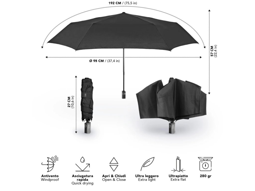 Perletti Technology Piatto Black je moderný skladací dáždnik s minimalistickým dizajnom a technickými vlastnosťami, ktoré z neho robia ideálneho spoločníka pre každodenné používanie. Vďaka extra tenkému profilu sa dáždnik jednoducho zmestí do každej tašky alebo ruksaku bez toho, aby zaberal veľa miesta.