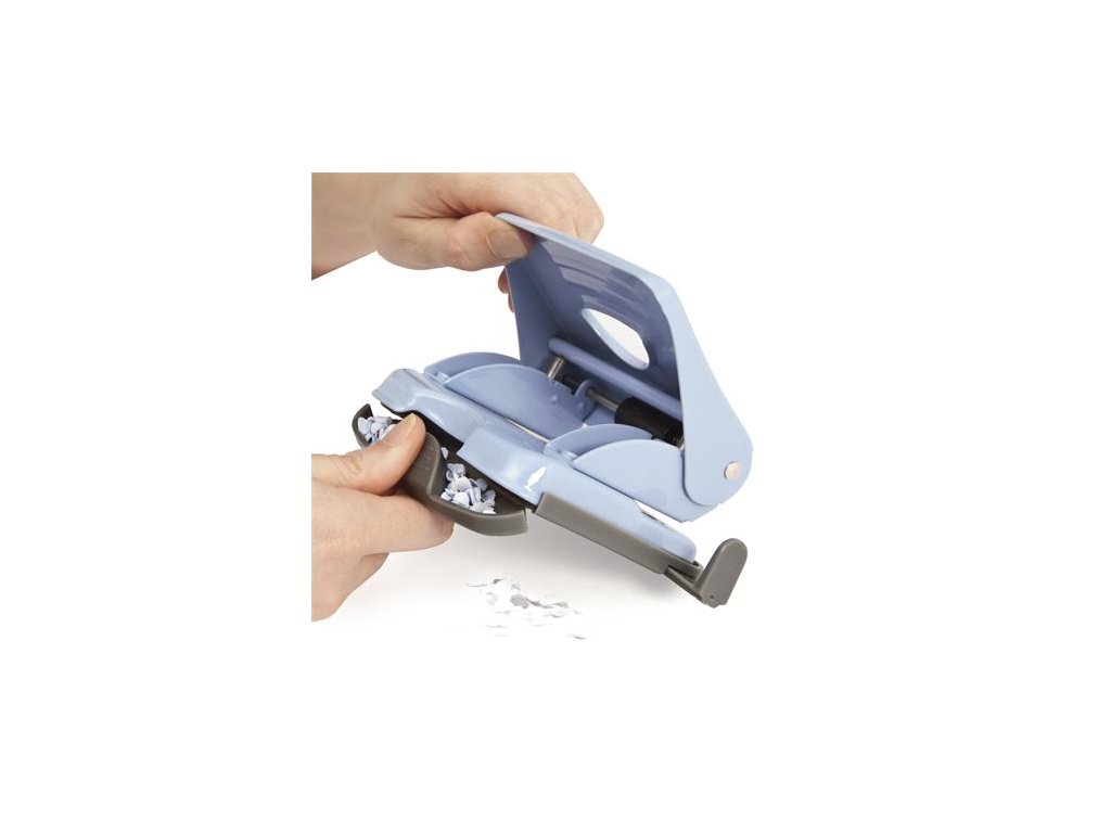 Kovová ručná dvojdierová dierovačka s kapacitou 25 listov s ľahko vyprázdniteľnou táckou s odpadom a popisovateľnou menovkou