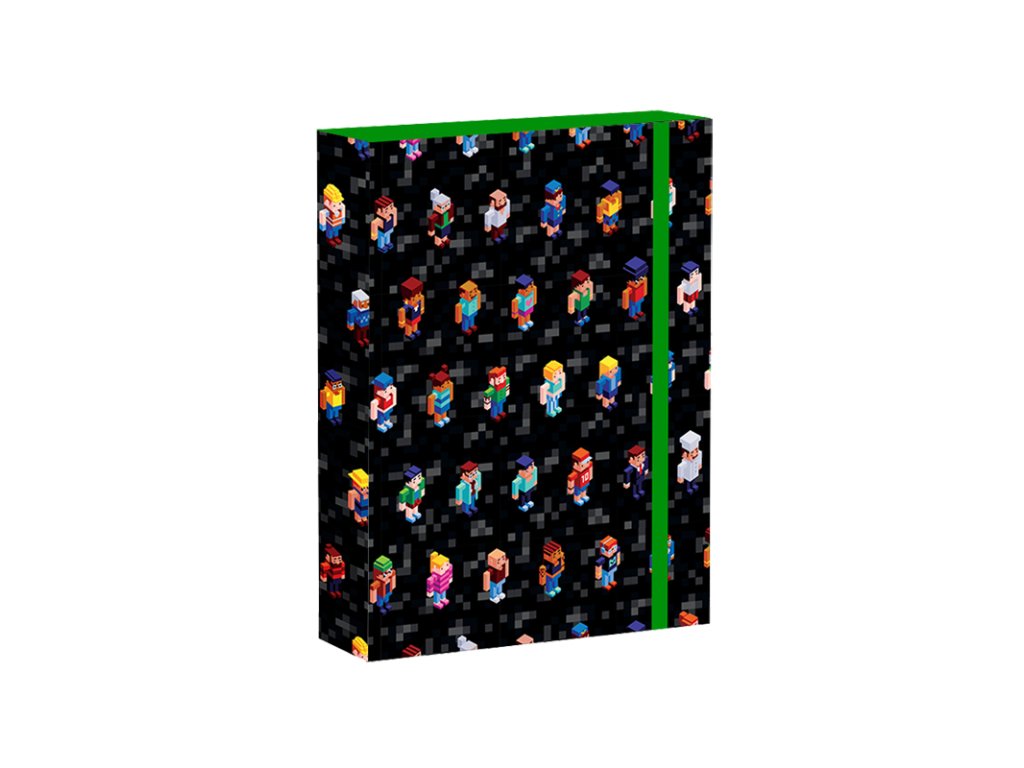 Školský box na zošity, formát A5, s motívom, zatváranie zaistené gumičkou, tvrdý karton. Rozmery: 16x22x3 cm