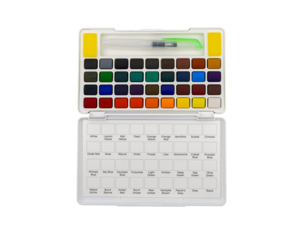 V jednom kompaktnom balení nájdeš všetko potrebné pre akvarelovú tvorbu – širokú paletu farieb, vodný štetec a vstavanú paletku na miešanie.