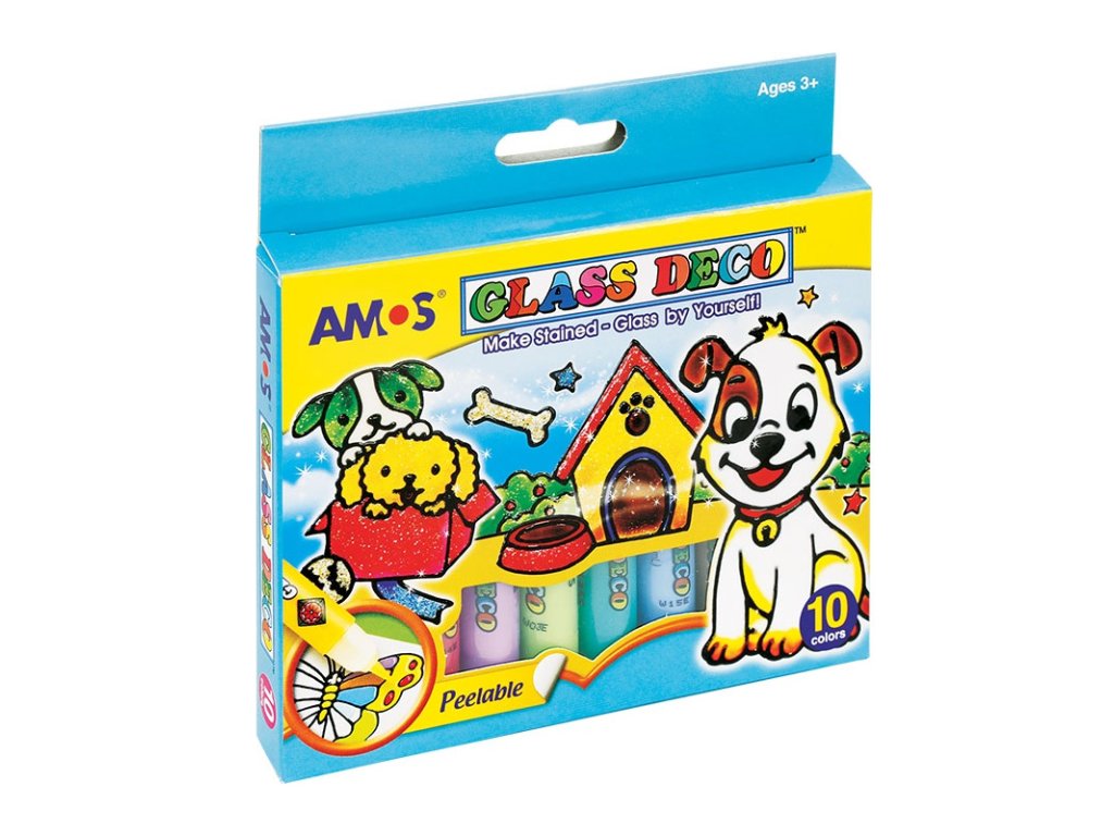 AMOS Glass Deco – vitrážové farby 10 × 10,5 mlVytvorte si svoje vlastné „sklenené vitráže“ s obľúbenou sadou AMOS Glass Deco. Tieto kvalitné farby sú určené na maľovanie a zdobenie skla, porcelánu, zrkadiel, dlaždíc a plastov, vďaka čomu ponúkajú široké možnosti pre tvorenie.