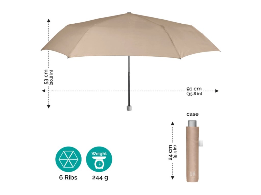 Dáždnik váži do 300 g a po zložení sa zmestí do kabelky či batohu. Automatické otváranie jedným tlačidlom je rýchle a pohodlné.