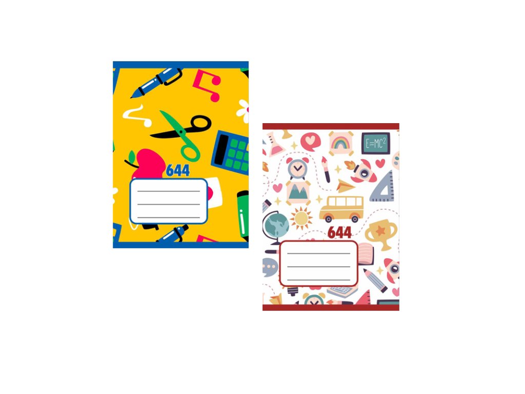 Školský zošit 644, formát A6, linajkový, 40 listov, výška riadka 8 mm. Rôzne vzory na prednej strane, náhodný výber.