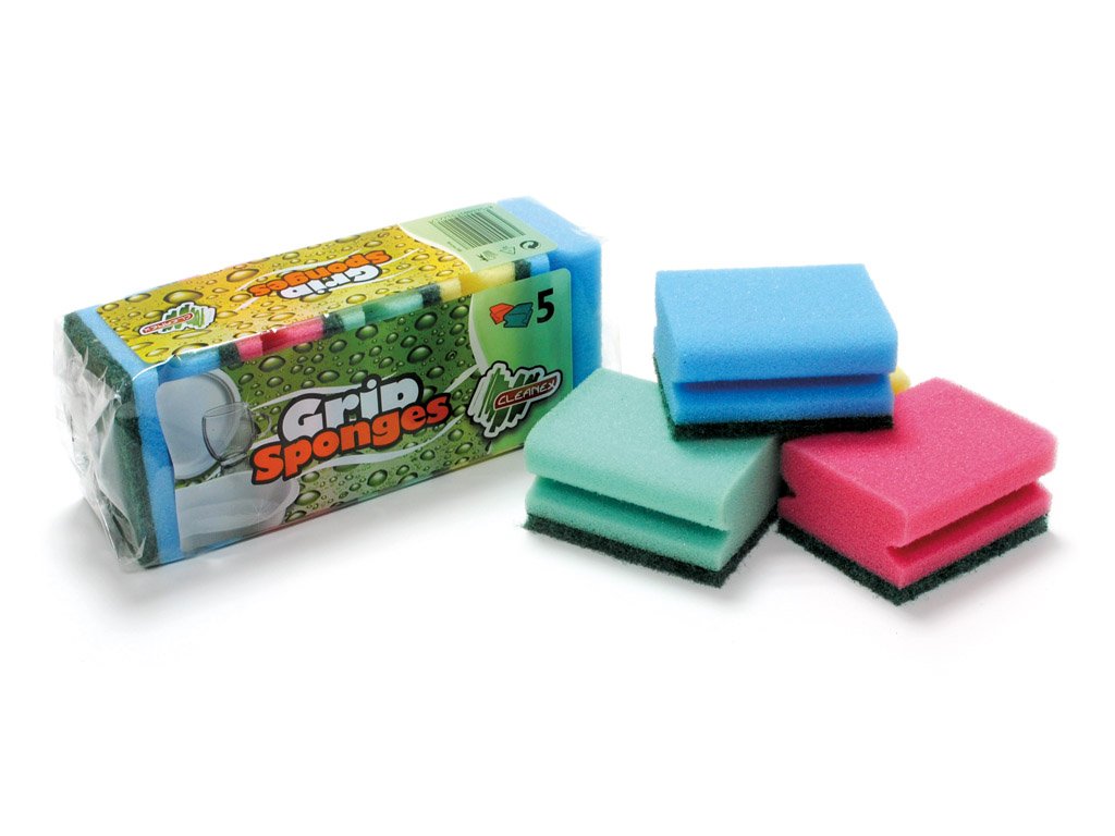 Špongie na umývanie riadu tvarované 9x7x4,5 cm. Zelený pad má väčšiu abrazívnu schopnosť a preto je vhodný na bežný riad a povrchy, kde nehrozí poškriabanie padom, rôzne farby v mixe, 5 kusov v balení. Zloženie: polyuretán, abrazív.