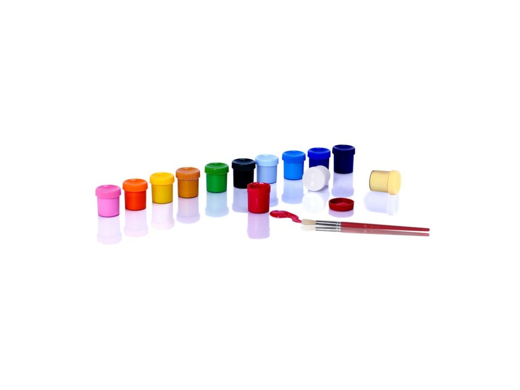 • balenie obsahuje 12 farieb po 20 ml v plastových téglikoch (biela, žltá, oranžová, ružová, okrová, svetlomodrá, tmavomodrá, svetlozelená, tmavozelená, červená, hnedá, čierna)