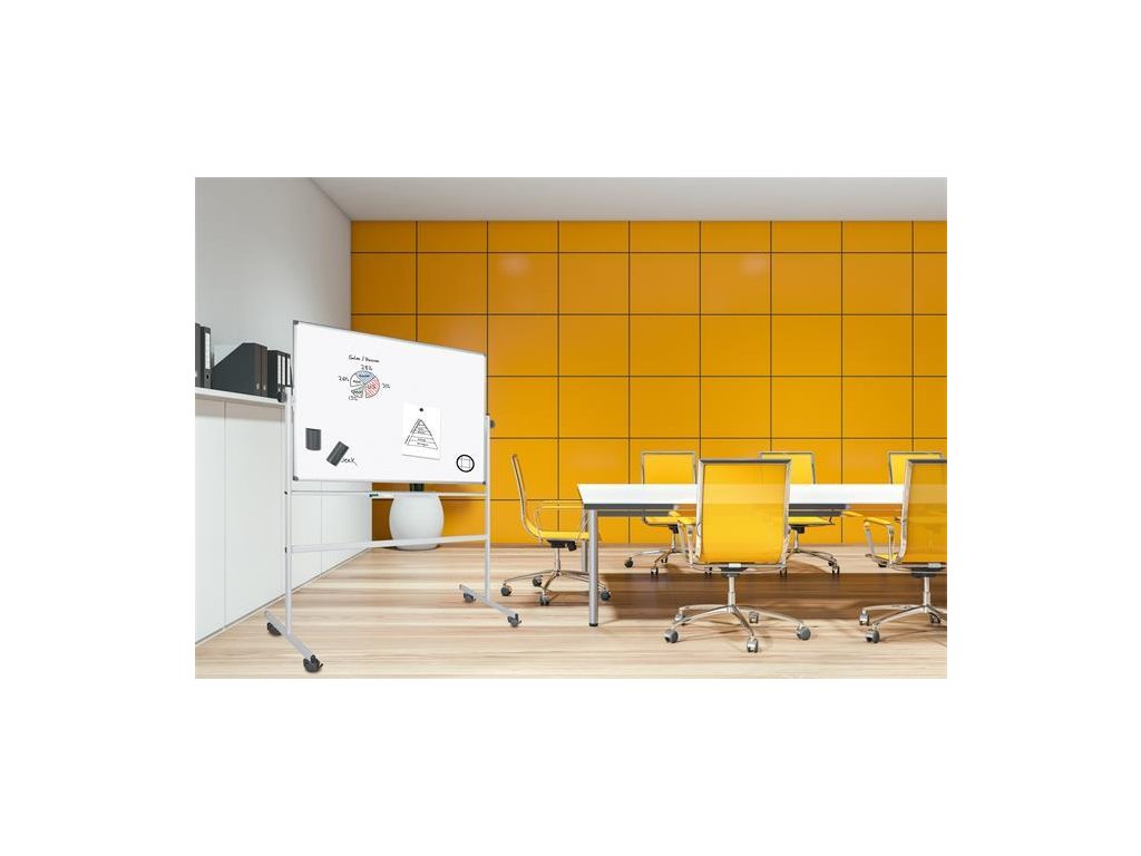 Stierateľná biela otáčateľná obojstranná magnetická tabuľa s hliníklovým rámom, popisovateľná popisovačom. Dá sa upevniť v požadovanom uhle a je dodávaná so stojanom, 5 ročná záruka na povrch