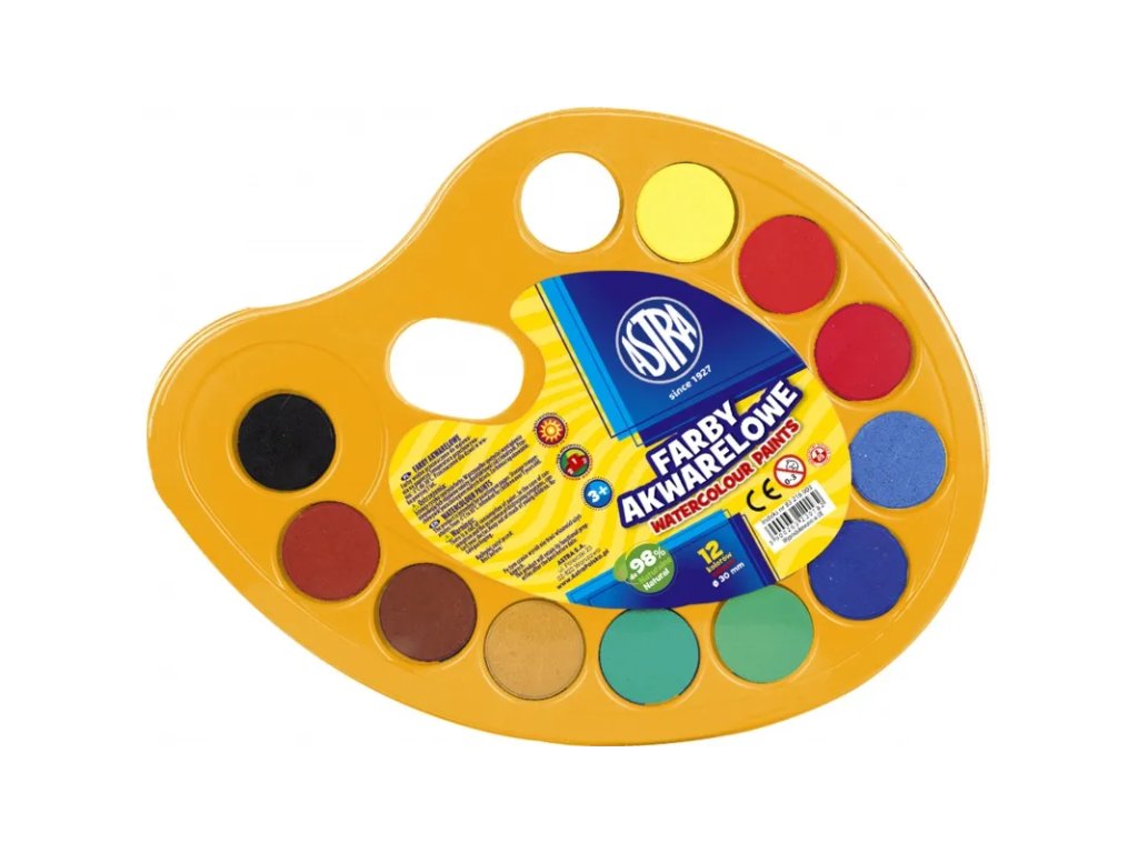 Vodové farby ASTRA na paletke sú obľúbeným výtvarným pomocníkom pre deti, žiakov i kreatívcov. Obsahujú 12 sýtych farieb v praktickej plastovej paletke s otvormi na uchopenie, čo uľahčuje manipuláciu aj tým najmenším rukám.